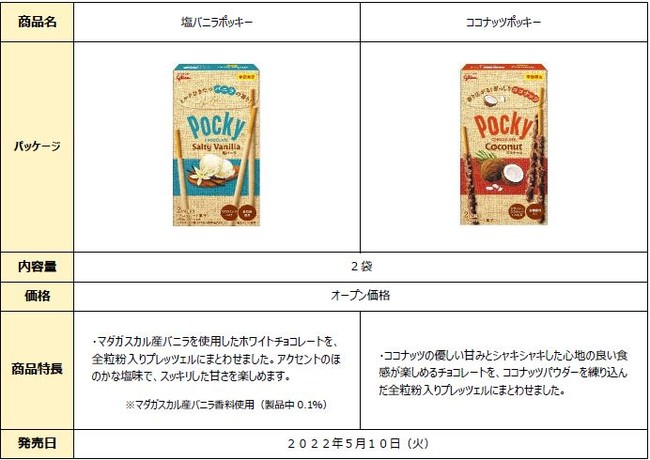 江崎グリコ株式会社は、「ポッキー」の夏季限定品として、バニラ香るチョコレートに塩をトッピングした新商品「塩バニラポッキー」と、プレッツェルにココナッツパウダーを練り込み進化した「ココナッツポッキー」を、2022年5月10日(火)より全国にて数量限定で発売します。