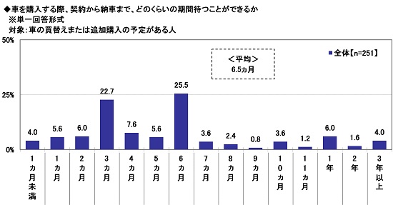 また、車を購入する際、契約から納車まで、どのくらいの期間待つことができるかを聞いたところ、「3ヵ月」(22.7%)や「6ヵ月」(25.5%)との回答が多く、平均は6.5ヵ月でした。