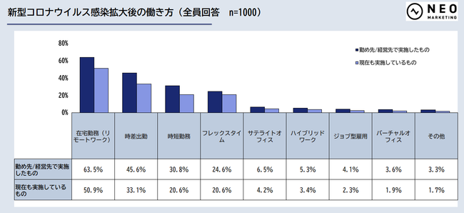 しかし、現在は「在宅勤務(リモートワーク)」50.9%、「時差出勤」33.1%、「時短勤務」20.6%と10ポイント以上減少している結果となっています。