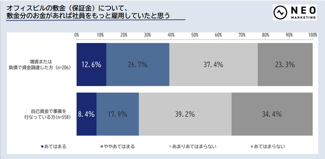 敷金(保証金)について、増資または負債で資金調達を行なった経験のある経営者の39.3%が「そのお金があれば社員をもっと雇用していたと思う」と回答しました。