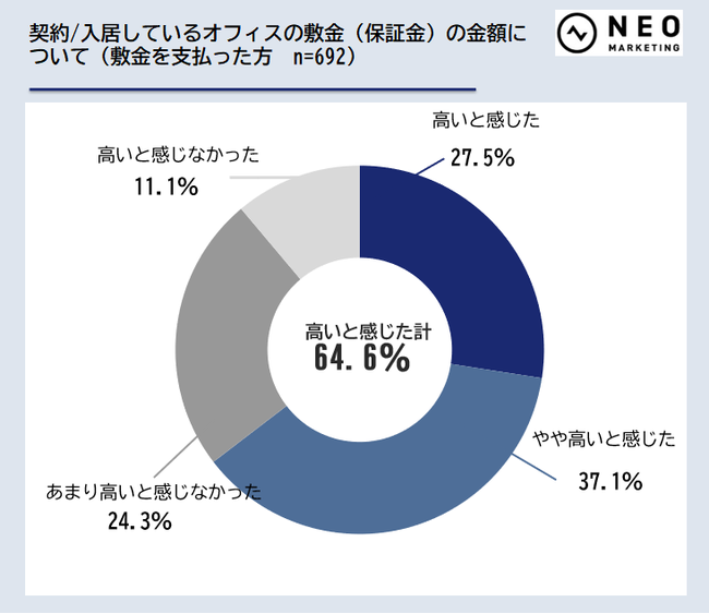 従業員1人あたり3万円程度かかるといわれる引越し費用。一方、「敷金(保証金)」は賃料の6~12カ月分が相場ともいわれています。そこで、入居しているオフィスビルの創業時や移転時に支払った敷金(保証金)をお聞きすると、 平均455万円となりました。中には、2億円もの敷金(保証金)を預けている中小・スタートアップ企業経営者も。敷金(保証金)に対し、「高いと感じた」と回答した経営者は計64.6%となっています。移転の際に、こうした費用が再度必要になることを懸念している経営者が多いのではないでしょうか。
