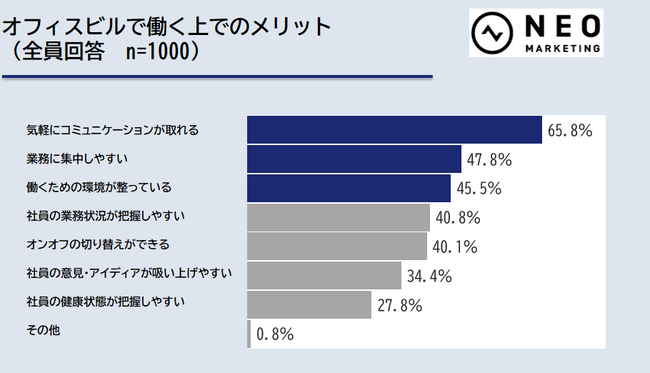 オフィスビルで働く上でのメリットに関しては「気軽にコミュニケーションが取れる」65.8%、「業務に集中しやすい」47.8%、「働くための環境が整っている」45.5%という順になりました。オフィスではリモートワークでのデメリットとして挙がった「コミュニケーション不足」、「業務がリモートで対応できるものに限られる」という項目を解消できると感じている経営者が多いようです。