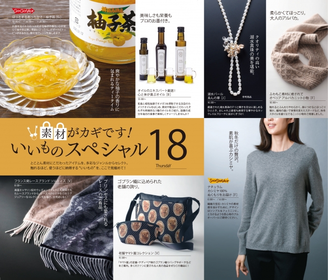 24時間365日生放送のショッピング専門チャンネル「ショップチャンネル」(ジュピターショップチャンネル株式会社、代表取締役社長:田中惠次、所在地:東京都中央区)は、10月18日(木)に「素材がカギです!いいものスペシャル」を約14時間にわたって放送します。番組では多彩なジャンルからとことん素材にこだわったアイテムの数々をご紹介します。