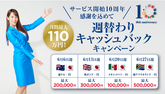 SBI FXトレード株式会社(本社:東京都港区、代表取締役社長:藤田 行生、https://www.sbifxt.co.jp/、以下「当社」)は、サービス開始10周年を迎えるにあたり、日ごろのご愛顧に感謝し、下記のとおりキャンペーンを実施いたしますのでお知らせいたします。