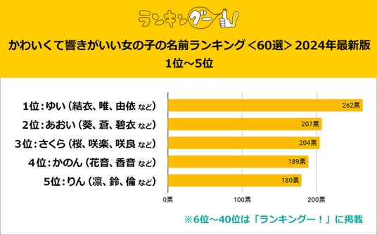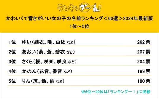 ランキングー!では『かわいくて響きがいい女の子の名前ランキング<60選>2024年最新版』を調査。10~50代の男女(性別回答しないを含む)5,758名にアンケートを行い、TOP40を決定。また、その他人気の名前20種類も公開しました。今回はその結果を元にTOP5をご紹介します。