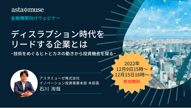 アスタミューゼ株式会社(本社:東京都千代田区、代表取締役社長 永井歩)は、2022年12月9日15時~/12月15日16時~の両日において、「ディスラプション時代をリードする企業とは~技術をめぐるヒトとカネの動きから投資機会を探る~」と題し、金融機関向け無料ウェビナーを開催いたします。