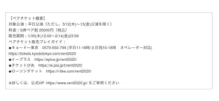 2月14日はバレンタインデー。大切な人や仲間との愛情、友情、絆の尊さを描く「レント」にとってぴったりな愛溢れる季節に、期間限定でペアチケットの販売が行われることが決定しました。