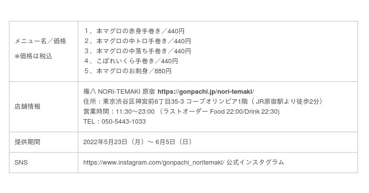 海苔手巻き専門店「 権八 NORI‐TEMAKI 原宿」は、 2022年5月30日に開店4周年を迎えます。日頃のご愛顧に感謝の気持ちを込めて 、長崎県対馬産本マグロを使用したスペシャルメニューを、5月23日(月)~ 6月5日(日)の期間限定で提供いたします。https://gonpachi.jp/nori-temaki/
