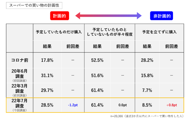 前問を裏付けるように、スーパーでの買い物の計画性について、「予定を立てずに購入」が0.8ポイント上昇しました。コロナ禍で増えた「予定していたものだけを購入」する計画購買派が1.2ポイント減少しました。