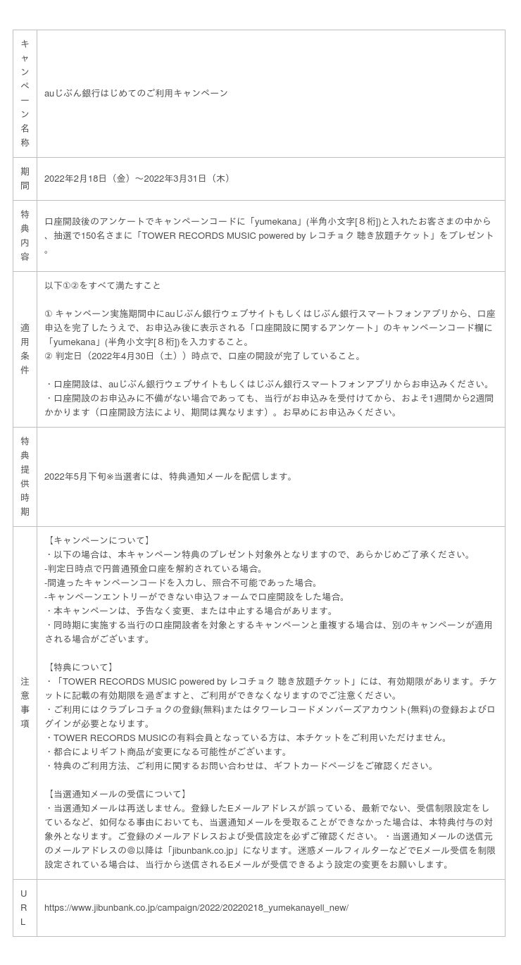 キャンペーン期間中にauじぶん銀行口座開設をお申込みいただいたお客さまを対象に、お申込み後のアンケートでキャンペーンコードに「yumekana」と入力したお客さまの中から、抽選で150名さまに「TOWER RECORDS MUSIC powered by レコチョク 聴き放題チケット*」をプレゼントします。