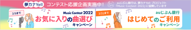 auじぶん銀行株式会社(本社:東京都中央区、代表取締役社長:臼井 朋貴、以下 auじぶん銀行)は、2021年1月から協賛している社会貢献プロジェクト『夢カナYell Project Supported by au じぶん銀行』の第3回コンテスト「Music Contest 2022」と連動して、2022年2月18日から、「夢カナYellコンテスト応援企画」と題し、「auじぶん銀行はじめてのご利用キャンペーン」と「お気に入りの曲選びキャンペーン」の2つのキャンペーンを実施します。