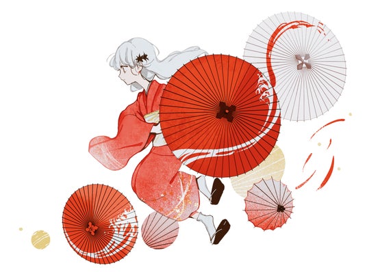 ▲郷土の花と黒百合の髪飾りを身に着けたキャラクターと波柄の和傘のイラスト