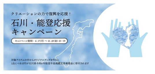 みなさまの「好き」にとことんこだわったアイテム作りを応援するBUZZUはこの度、能登の復興をクリエーションの力で応援したい、という思いの下、2024年6月17日(月)から12月20日(金)の期間、「クリエーションの力で復興を応援!石川・ 能登応援キャンペーン」を実施いたします。期間中、BUZZUサイトで指定の寄付つきアイテム5種(長袖Tシャツ、半袖Tシャツ、トートバッグ、マグカップ、ミニボトル)を使ってご自身のオリジナルグッズを制作いただくと、売上の一部が能登半島地震災害義援金へ寄付されます。