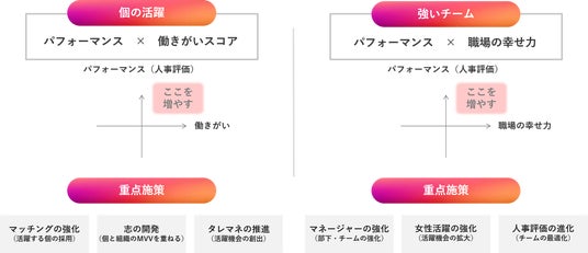 当社グループが取り組む様々なWell-beingに資する活動は、中期人事戦略『人と組織の可能性を引き出す』をもとに行っています。その中で、意志を持ったチェンジエージェント(変革の担い手)が育ち、可能性とパフォーマンスを引き出し合う組織をありたい姿としており、そのためには【個の活躍】と【強いチーム】を継続的に作り続けることが必要であると考えています。【個の活躍】は“パフォーマンス×働きがいスコア” (Well-beingレポートVol.2参照* )を、【強いチーム】は“パフォーマンス×職場の幸せ力”を重要な指標として設定しました。
