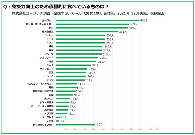 株式会社ユーグレナは、2021年12月に20代から60代の男女1000人を対象に、「免疫力向上のため積極的に食べているもの」に関して調査しました。その結果をうけ、免疫に詳しい日比野佐和子先生から、食生活でより効果的に免疫力を高める方法をアドバイスいただきます。