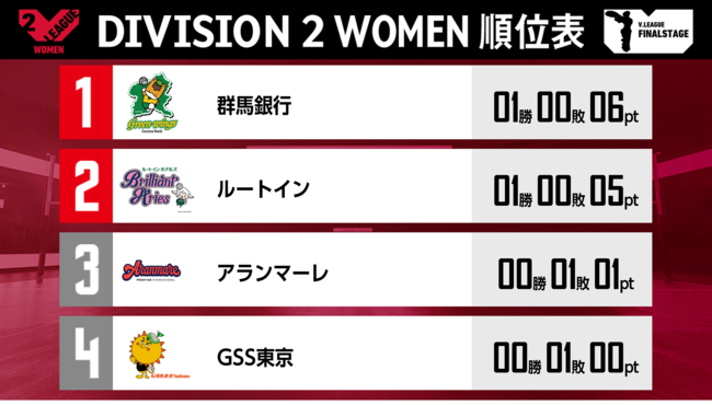V2女子ファイナル・ルートインがアランマーレに勝利し、群馬銀行との差を縮める