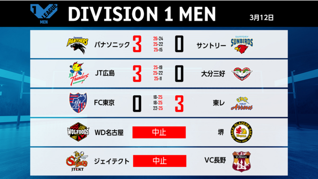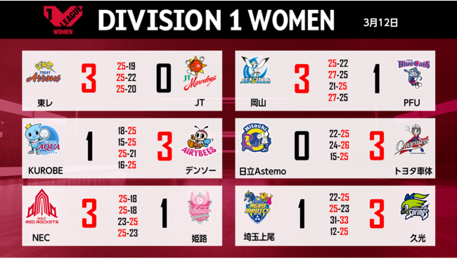 バレーボール国内最高峰リーグ V.LEAGUE【3月12日の試合結果】