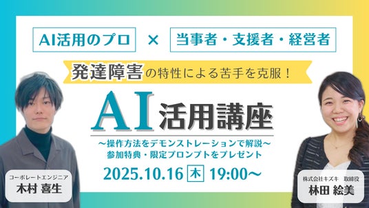 発達障害による苦手を克服するための“AI攻略法”を紹介する無料オンライントークイベントを開催。大手IT企業でAI活用推進に携わるエンジニアの木村喜生氏とキズキ取締役・林田が登壇します。