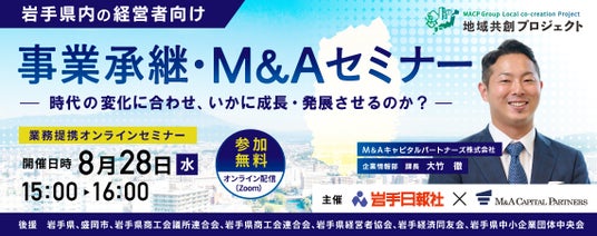 今回は、岩手日報社との業務提携記念セミナーとして、岩手県内の経営者向けに「事業承継の選択肢のひとつであるM&A」についての理解が深まるお話をさせていただきます。