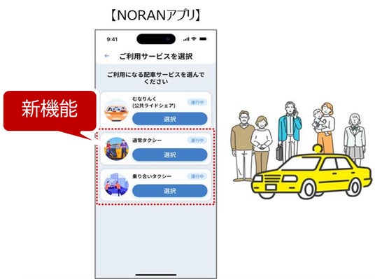 本実証事業では同年7月28日より、アルパインマーケティングとゼンリンが共同開発した配車アプリ・システム「NORAN(ノラン)」を導入し、公共ライドシェアのオンデマンド配車予約・配車指示に対応してきました。このたび2月6日(金)から2月27日(金)までの期間、本アプリにて新たに乗り合いタクシーおよび通常タクシーの配車機能の提供を開始します。宗像市では公共ライドシェアに加え、乗り合いタクシー、通常タクシーの配車が1つのアプリで完結。利用者のライフスタイルや移動のニーズに合わせた交通手段の選択を支援します。