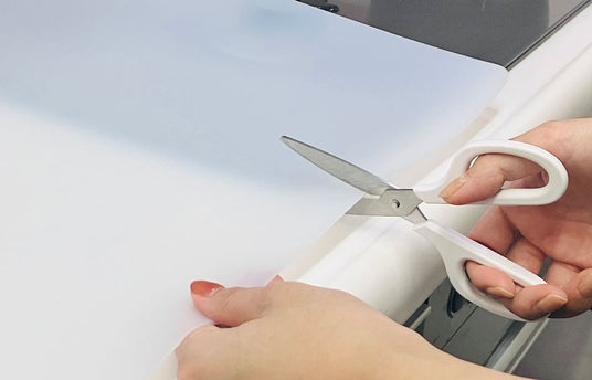 4種類のサイズ展開に加え、ハサミやカッターで簡単にカットが可能です。キッチンの形状や、コンロ周りの避けるべきスペースに合わせて、ご自宅の環境に最適な形に整えられます。