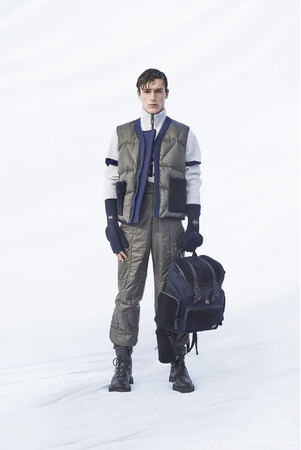 メンズコレクションは、様々なアイテムが実用的なデザインで展開されます。ダウンジャケットやディテールに使われる耐久性の高いウールは、クラシックなチェッカー柄でアクセントを添えています。パファー・ジャケット、ウィンドブレーカー、ジャンプスーツ、ジレ、コートなどに施された異素材を組み合わせたパッチポケットやエルボーパッドのディテール、アーミーグリーンとディープブルーの色使いが、機能性を兼ね備えたウエアを控えめながらも洗練されたアイテムに昇華させています。