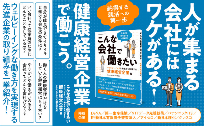 掲載企業は、DeNA、第一生命保険、NTTデータ先端技術、パナソニックITS、EY新日本有限責任監査法人、アイセロ、新日本理化、クレスコ。出版社が直接各企業に取材をしているからこそ、担当者の熱い想いが凝縮されています。