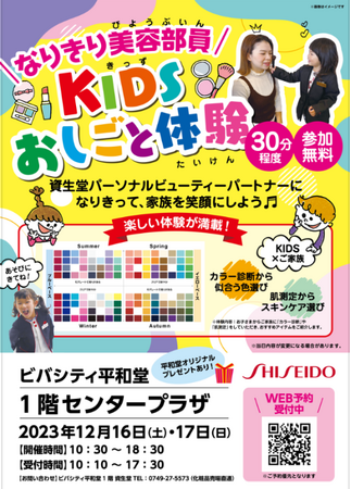 株式会社平和堂(滋賀県彦根市、代表取締役社長執行役員︓平松正嗣、以下「平和堂」)は、 ビバシティ平和堂におきまして、12月16日(土)と17日(日)の2日間、「なりきり美容部員KIDSおしごと体験」&「カラー診断」イベントを開催しますのでお知らせします。