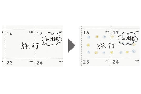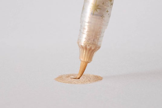 ベースインキが無色透明のため、文字やイラストの上に重ねて描くことができます。また、重ね塗りをすることでグリッターの量を調節しやすく、お好みの輝き度合いを自在に演出することができます。