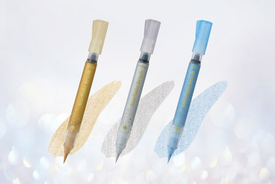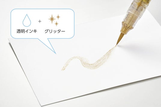 「スターフレークブラッシュ」は、無色透明のインキにグリッター顔料を含有した、毛筆タイプの筆ペンです。カラーペンの上に重ねても、下地の色を生かし、グリッターの繊細な輝きを加えた華やかな筆跡にすることができます。グリッターの色はゴールド、シルバー、ブルーの3色展開で、カラー筆ペンとの合わせ使いを楽しめるスターターセット4種も同時に限定発売します。単体での使用はもちろん、文字やイラストの仕上げに描き足したり、カラーペンと混ぜて使ったり、異なる色や質感の描画材と自由に組み合わせることで、星屑のような輝きが加わり、手描きの表現が目を引く印象的な仕上がりになります。