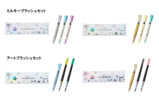 スターフレークブラッシュと、カラー筆ペンとの合わせ使いをより楽しめる、限定スターターセットを同時発売いたします。ペンケースとしても使えるオリジナルのマルチケースに、スターフレークブラッシュ1色と、パステルカラーの筆ペン「ミルキーブラッシュ」または、色鮮やかな発色のカラー筆ペン「アートブラッシュ」を組み合わせた3本をセットしています。セットには合わせ使いのヒントや作例を掲載したリーフレットも付属しています。