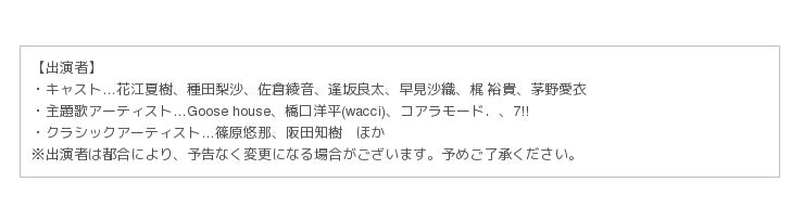 そして、4月5日にはTVアニメのメインキャスト、主題歌、クラシックアーティストが集結し、「四月は君の嘘」の物語を朗読と音楽と映像で堪能できる一夜限りのフィナーレイベントが開催される。出演者は、花江夏樹(有馬公生役)、種田梨沙(宮園かをり役)、佐倉綾音(澤部椿役)、逢坂良太(渡亮太役)、早見沙織(井川絵見役)、梶裕貴(相座武士役)、茅野愛衣(相座凪役)の各キャストと、主題歌を担当するGoose house、橋口洋平(wacci)、コアラモード.、7!!。さらに劇中の音楽演奏を行っている、篠原悠那(ヴァイオリン)、阪田知樹(ピアノ)らが登壇する。