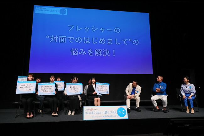 今回、実際に今年の4月に新社会人・新大学生となったフレッシャーたちをご招待し、コミュニケーション強者である「チョコレートプラネット」のお二人と「関根麻里」さんが、フレッシャーたちの様々なコミュニケーション悩みに答える、公開イベントを4月6日に実施しました。イベント当日は、「長田」さん扮する “財津啓司”と、「松尾」さん扮する、人や動物などありとあらゆるものがどれだけキレイな息になるかを研究し、コミュニケーションをリフレッシュさせるナゾの新キャラクター “息綺 麗(いきき れい)”の2人による独自の視点と、関根さんの的確なアドバイスでフレッシャーたちのコミュニケーション悩みをすっきり解決しました。