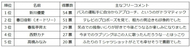 1位にはモデルの新川優愛さんが輝きました。人気モデルが一般のバス運転手の方に自らアプローチをしたというドラマチックななれそめが話題になりました。テレビで公開プロポーズをし、相方の若林さんの男泣きも話題になったオードリー春日さんは僅差で2位にランクインしました。