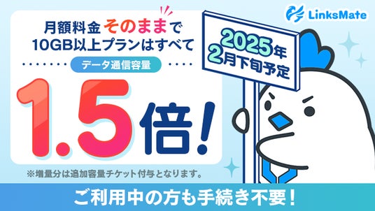 株式会社LogicLinks(以下LogicLinks、本社:東京都渋谷区、代表取締役社長:春田 康一)は、MVNOサービス「LinksMate」において2025年より10GB以上のプランにて月額料金そのままにデータ通信容量を増量することをお知らせいたします。