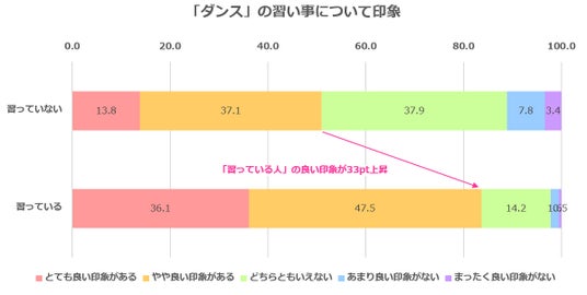 5:「ダンス」の印象は習っていない人と習っている人で大きく変化。印象が良くなったと答えた人は、30ポイント以上増加し、そのうち、約9割の親が「子どもの成長が感じられる」と回答