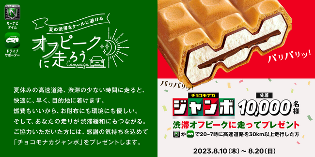 株式会社ナビタイムジャパン(代表取締役社長:大西啓介、本社:東京都港区)は、2023年8月10日(木)~8月20日(日)まで、カーナビアプリ『NAVITIMEドライブサポーター』と『カーナビタイム』にて、夏休みの高速道路オフピーク走行で森永製菓の「チョコモナカジャンボ」がもらえる「夏の渋滞をクールに避ける オフピークに走ろうキャンペーン」を実施いたします。