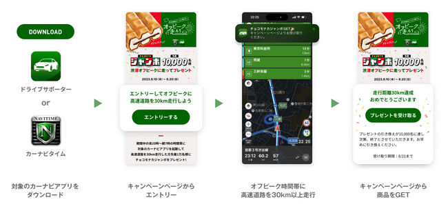『NAVITIMEドライブサポーター』もしくは『カーナビタイム』アプリ内にあるキャンペーンページからエントリーをし、対象期間中に、アプリを起動した状態で、高速道路のオフピーク時間帯(20:00~06:59)に高速道路を累計30km以上走行すると、先着10,000名様に、森永製菓の「チョコモナカジャンボ」と引き換えられるチケットをプレゼントいたします。