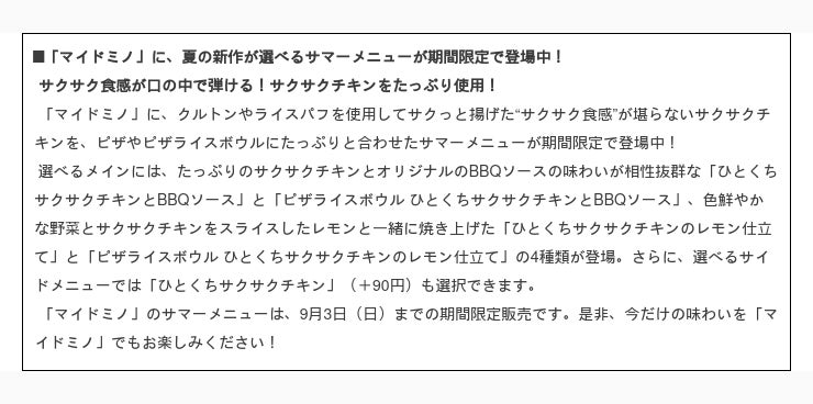 「マイドミノ」200万食達成を記念して、皆さまへの感謝の気持ちとともに大好評の声にお応えするべく、「マイドミノめざせ200万食キャンペーン」から「マイドミノ200万食達成!感謝キャンペーン」とキャンペーン名を変更し、平日のランチタイム時に、お持ち帰り限定で「マイドミノ」が、699円~お買い求めいただける、大変おトクになるキャンペーンを延長し、7月24日(月)より開催します。7月18日(火)から発売になったばかりの「夏のサクサク・クワトロ」シリーズのうち、「ひとくちサクサクチキンとBBQピザソース」と「ひとくちサクサクチキンのレモン仕立て」のそれぞれピザ、ピザライスボウルがセットになったマイドミノも対象となります。おトクな期間に、いつものお気に入りの組み合わせをリピートするのも、新たな組み合わせに挑戦するものあなたの自由!お財布もお腹も心も満たし、大満足の“自分だけのお気に入りのセット”で、ワクワク楽しいランチタイムをお過ごしください。