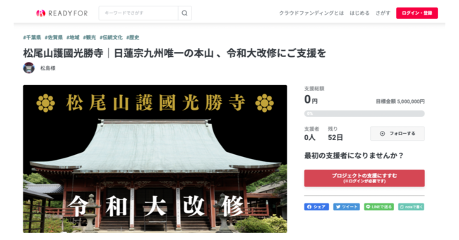 ・プロジェクトタイトル:松尾山護國光勝寺|日蓮宗九州唯一の本山 、令和大改修にご支援を