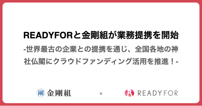 今回の提携を通じて、金剛組と取引のある全国の神社仏閣にREADYFORをご活用いただくことで資金調達手段の多様化を図り、これまで経済的課題で難しかった建物の修繕や復元等の実現に寄与してまいります。