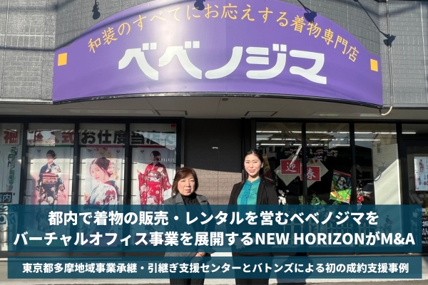 M&A総合支援プラットフォーム「BATONZ(バトンズ)」を運営する株式会社バトンズ(本社:東京都中央区、代表取締役CEO:神瀬悠一、以下バトンズ)は、東京都多摩地域事業承継・引継ぎ支援センター(所在地:東京都立川市、統括責任者:和田栄)とともに、有限会社ベベノジマ(所在地:東京都あきる野市、以下ベベノジマ)と株式会社NEW HORIZON(所在地:東京都港区、以下NEW HORIZON)のM&A成約を支援したことをお知らせします。