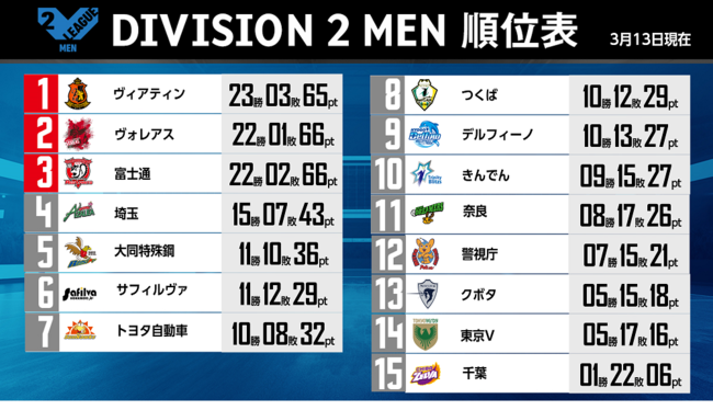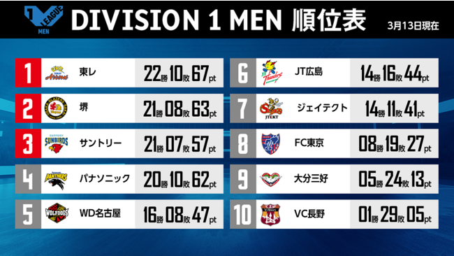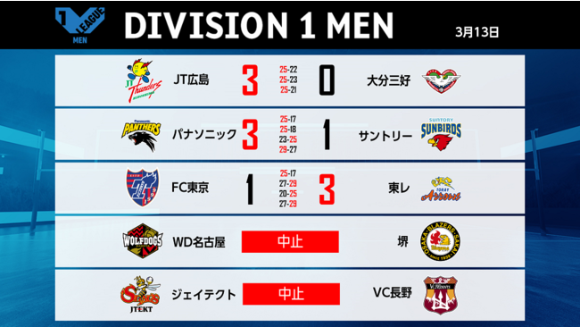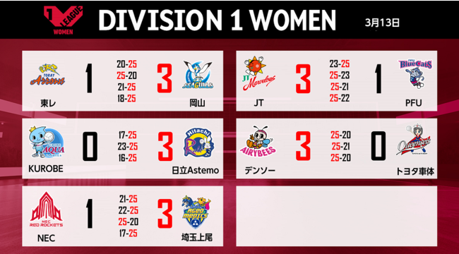 バレーボール国内最高峰リーグ V.LEAGUE【3月13日の試合結果】
