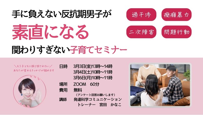 株式会社パステルコミュニケーション(本社:東京都豊島区、代表取締役:吉野加容子)の親子のコミュニケーションをスムーズにして子どもの発達を加速させる「発達科学コミュニケーション」講師・宮田かなこが、3/3,4,6日に「\過干渉は卒業できる/ 手に負えない反抗期男子が素直になる 関わりすぎない子育てオンラインセミナー」を行います。 お申込みはこちら<https://www.agentmail.jp/lp/r/8711/80258/>
