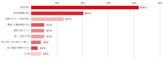 一方、アコムの改善点には、「金利が高い」ことを挙げた人が41.8%で最も多く、「無利息期間が短い」ことを指摘した人も20.3%いた。