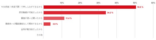 アコムのメリットには、「すぐに借りられる」ことを挙げた人が圧倒的に多く、過半数を上回った。なお、そのほかには、「職場への電話連絡がない」「審査に通りやすい」「借入・返済がしやすい」などを挙げる人が多かった。