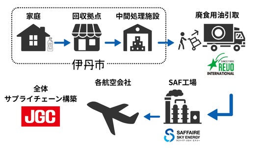 伊丹市内の市庁舎や市立体育館をはじめとする公共施設11箇所で伊丹市が回収した廃食用油をレボインターナショナルが収集し、国内初のSAF大規模生産を行うSAFFAIRE SKY ENERGYのプラント(コスモ石油堺製油所内、2024年12月完工)へ運び、国産SAFの原料として資源化します。