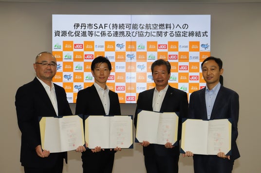 兵庫県伊丹市(市長:中田 慎也、以下「伊丹市」)、日揮ホールディングス株式会社(代表取締役会長兼社長CEO 佐藤 雅之、以下「日揮HD」)、株式会社レボインターナショナル(代表取締役CEO:越川 哲也、以下「レボインターナショナル」)および、合同会社SAFFAIRE SKY ENERGY(代表者:高田 岳志、以下「SAFFAIRE SKY ENERGY」)は、持続可能な航空燃料SAF(Sustainable Aviation Fuel、以下「SAF」)の原料となる使用済み食用油(以下「廃食用油」)の資源化促進を図るため、「持続可能な航空燃料への資源化促進等に係る連携及び協力に関する協定」(以下「本協定」)を2025年6月24日に締結し、同日、伊丹市役所内にて協定締結式を執り行いました。