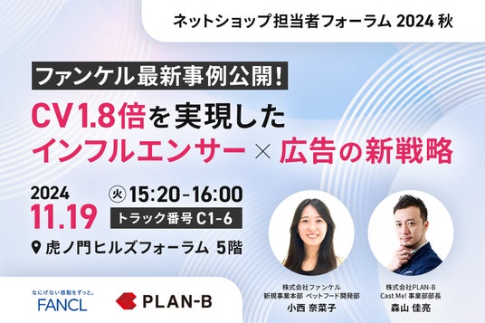 株式会社PLAN-B(東京都品川区、代表取締役:鳥居本真徳)は、 2024年11月19日(火)~20(水)に株式会社インプレスが虎ノ門ヒルズフォーラムで開催する『ネットショップ担当者フォーラム 2024 秋』にてゴールドスポンサーとして協賛し、「ファンケル最新事例公開!CV1.8倍を実現したインフルエンサー×広告の新戦略 」と題したセミナーに株式会社ファンケルと合同で登壇いたします。