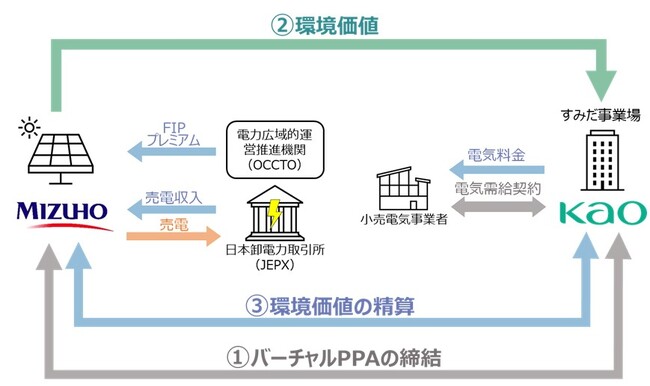 花王株式会社(社長・長谷部佳宏)(以下、花王)と、株式会社みずほ銀行(頭取・加藤勝彦)(以下、みずほ銀行)およびみずほリース株式会社(社長・中村昭)(以下、みずほリース)は、このたび、花王とみずほリースグループとの間でバーチャルPPA(Power Purchase Agreement:電力購入契約)を締結したことをお知らせします。